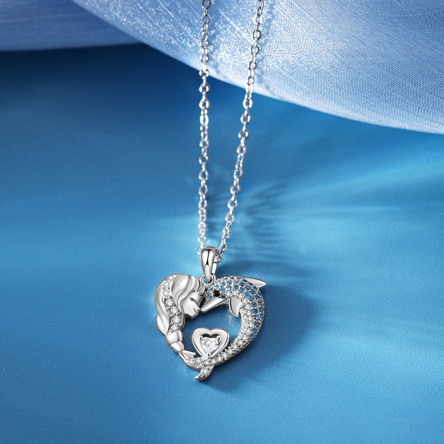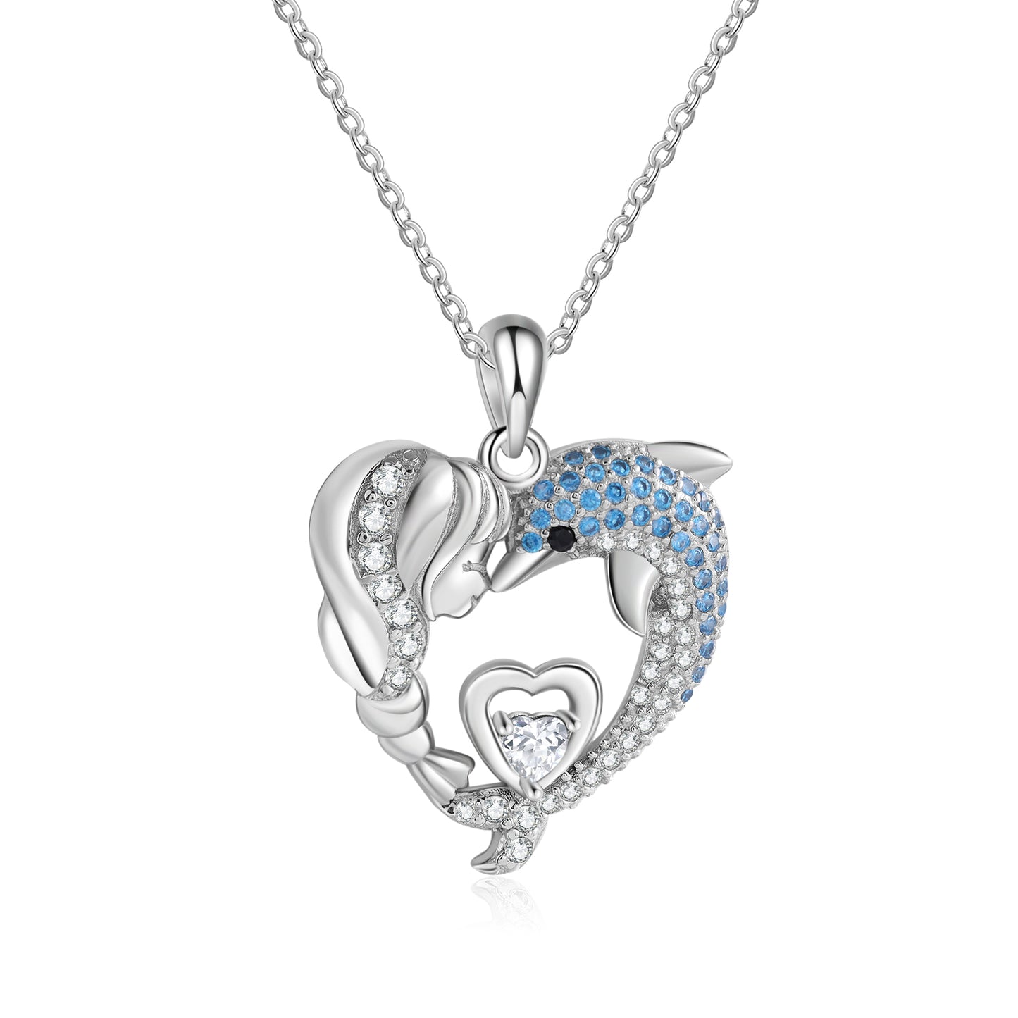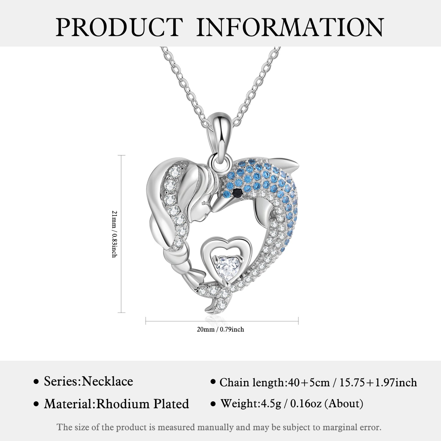 Plated in white gold, the necklace is crafted from high-quality copper, ensuring durability and longevity. The pendant features a heart-shaped design with a playful girl and dolphin, adding a touch of whimsy to your look.