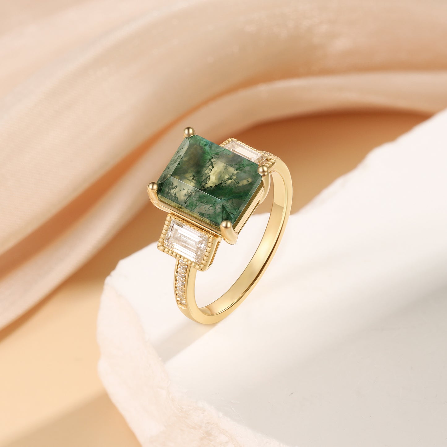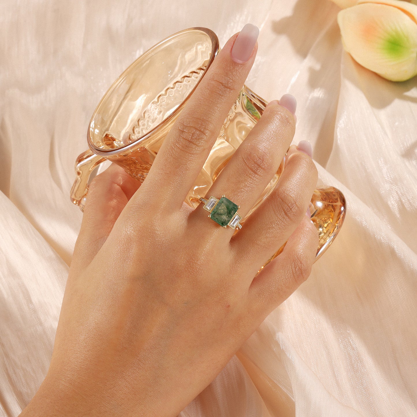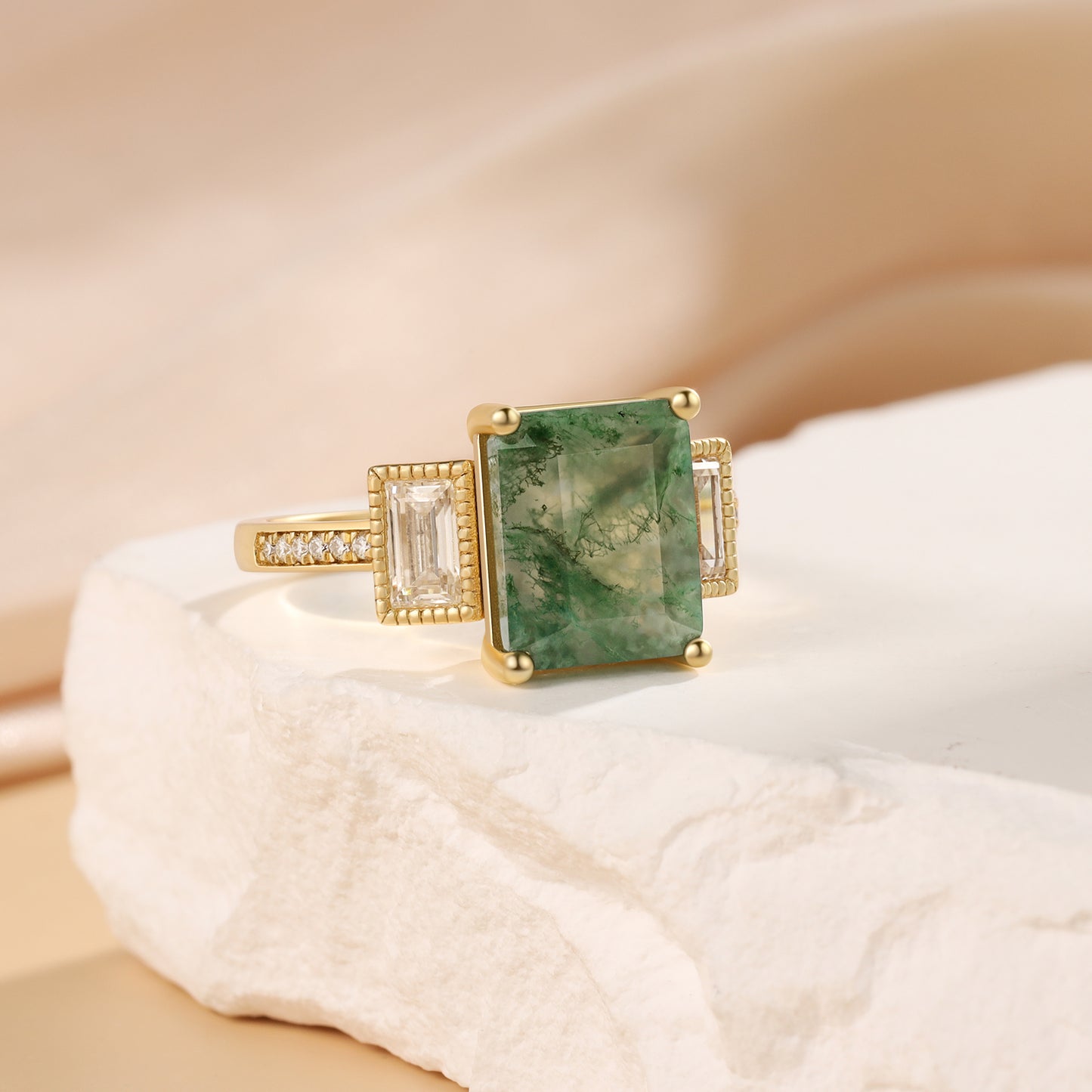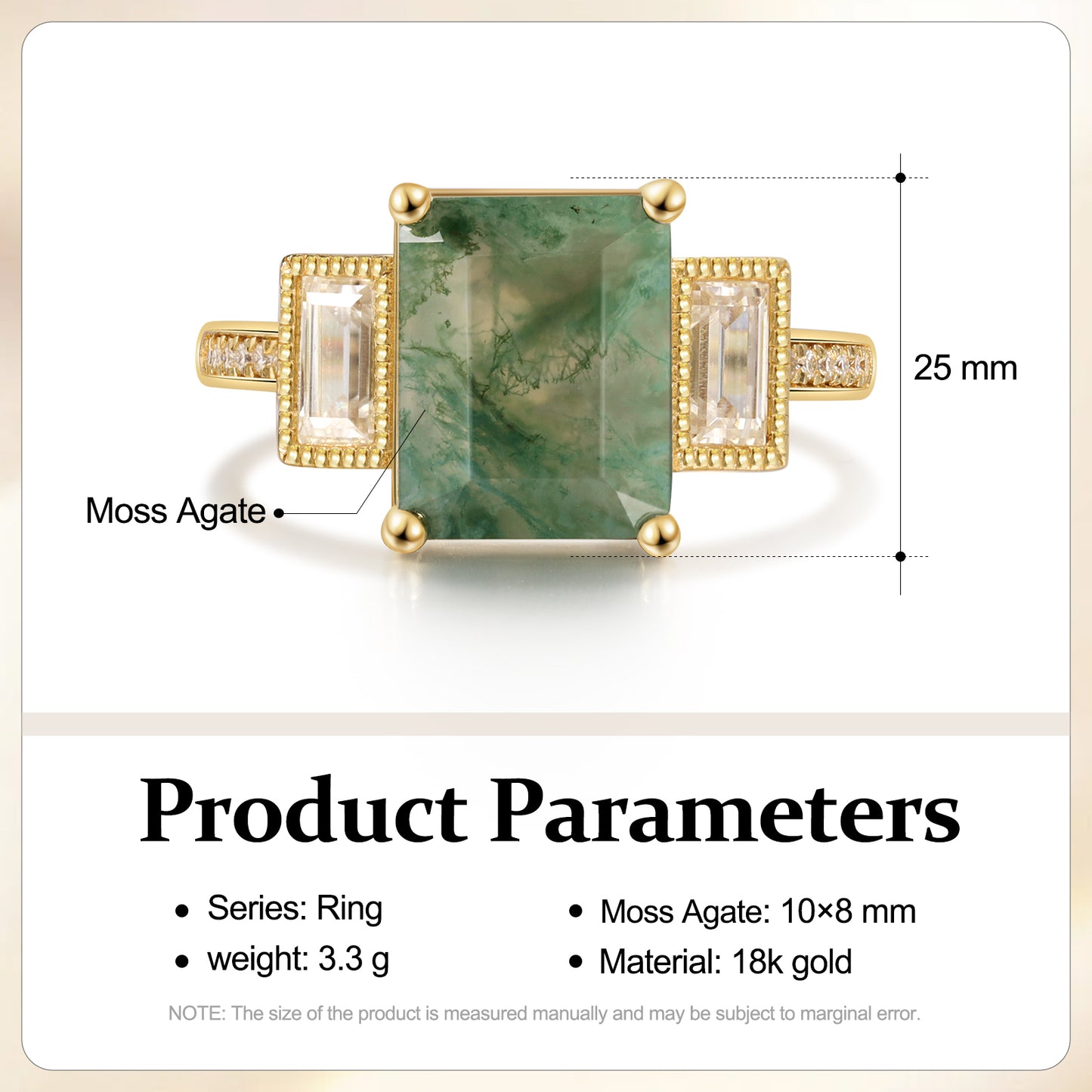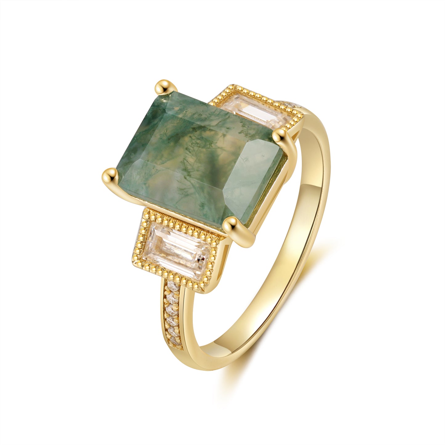This K Gold Moss Agate Ring is a fashionable accessory that will add a touch of elegance to any outfit. It is crafted from 18K Gold, 14K Gold, and 925 Sterling Silver, and is available in sizes #4 to #12. The ring weighs 3.3g and is plated with gold for a luxurious finish.