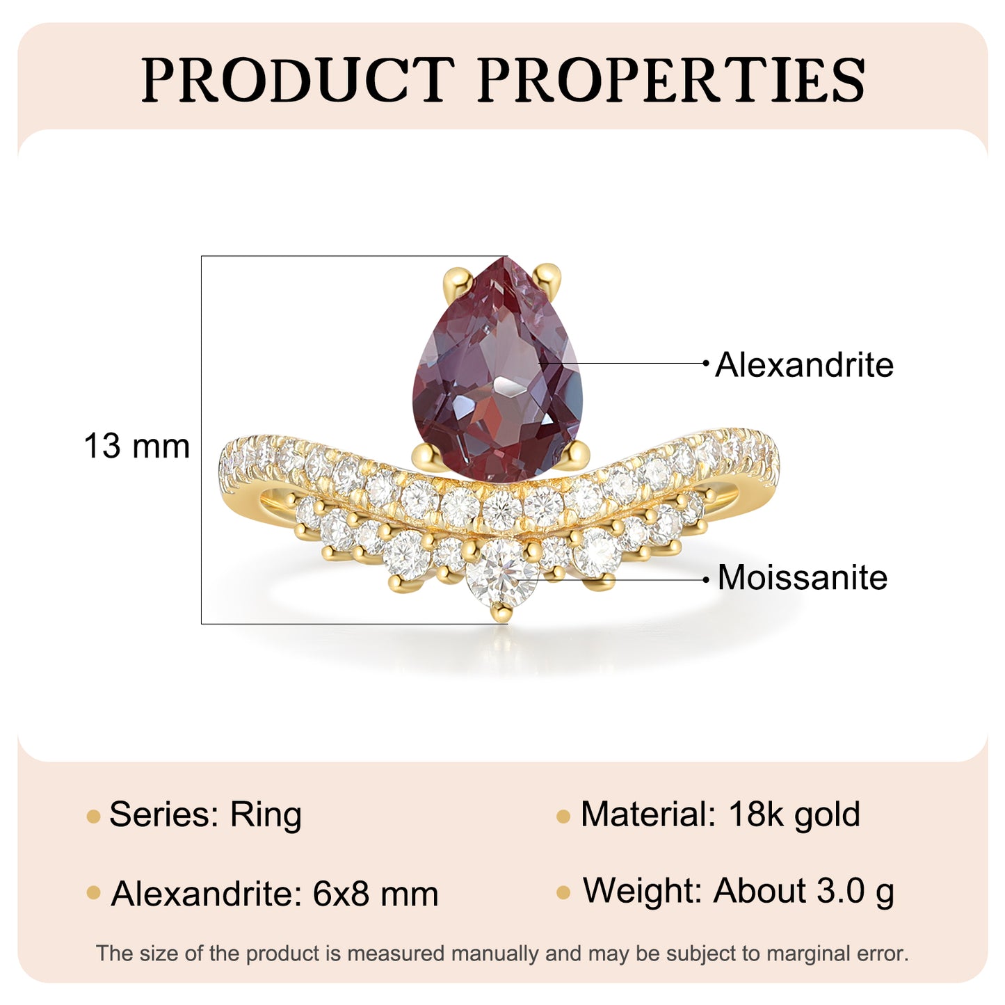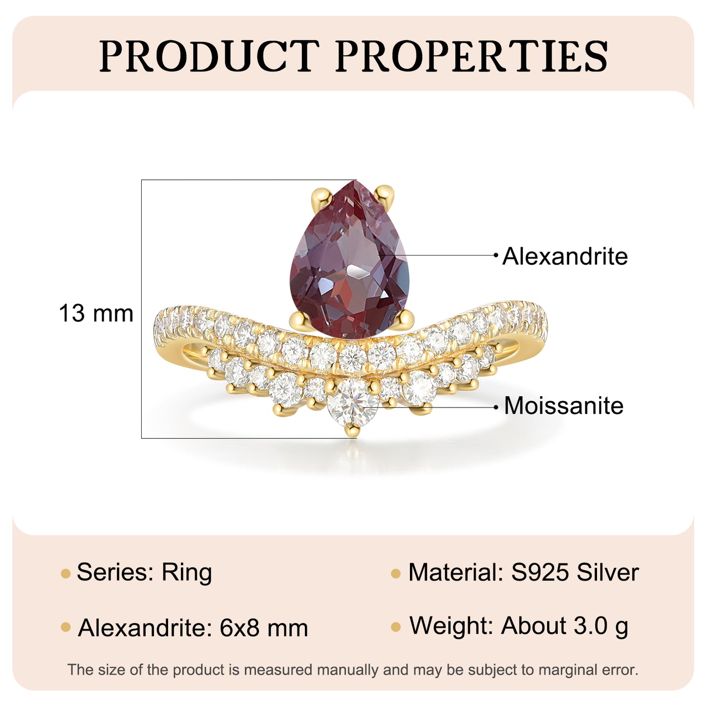 The ring comes in a wide range of sizes, from #4 to #12, ensuring a perfect fit for everyone. Despite its intricate design, it weighs only 3g, making it comfortable for everyday wear. The centerpiece, a natural Alexandrite, adds a unique charm to this exquisite ring.